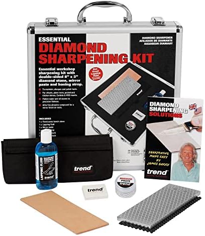 The Trend essential diamond sharpening kit contains: the Trend flagship double sided 300 coarse/1000 grit Fine 8” x 3” bench Stone, (DWS/CP8/FC), 100 ml bottle of lapping fluid, (DWS/lf/100), leather strop (DWS/HP/Ls), mirror finish Honing paste DWS/MP/40), cleaning Block (DWS/CB/a), catalog, breaking in instructions, A sharpening booklet and packed in a heavy duty aluminum case. The aluminum case has spare room for the addition of a second 8” X 3” bench Stone.