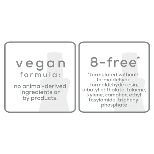 Vegan, No Animal Testing, 8-Free Formula: without formaldehyde, toluene, dibutyl phthalate, formaldehyde resin, camphor, ethyl tosylamide, xylene, triphenyl phosphate and animal derived ingredients.