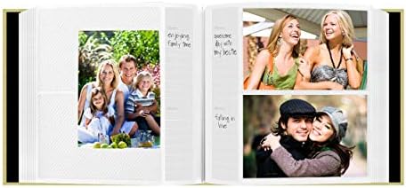This fabric cover photo album features a frame to insert a favorite photo and a deluxe rounded bookbound spine. The album’s patented Bi-Directional pockets hold horizontal or vertical photos up to 4 x 6 inches. There is a memo writing area next to each pocket. Photos are displayed two per page. The album holds 200 photos up to 4 x 6 inches in optically clear pockets with a shaded paper background. Archival, photo safe: acid, lignin and PVC free.