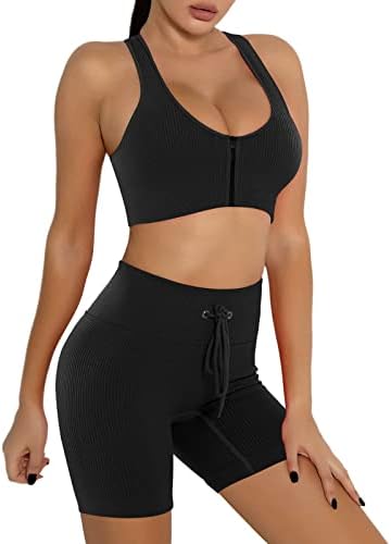【Zipper Fashion Design】-The sports bra pecial made with zipper and removable pads for the crop top/the back designed in racer vest,offer more support to upper body.High waist yoga shorts with adjustable drawstring,comfortable,squat proof and tighten your waist,show your figure perfectly.