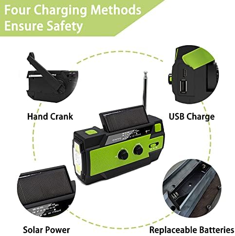 【4 Charging Modes】The upgraded hand crack radio has 4 power sources when you need a boost of power or need to recharge the raido. The hand crank lever and solar panel are both capable of regenerating enough power to keep the radio, lights, and SOS alarm ready to go when you need it most. The repleaceable 4000mAh inside ensure you have power when not able to regenerate power. Also, you can recharge the hand crack radio(inside the rechargeable battery) with power cord.