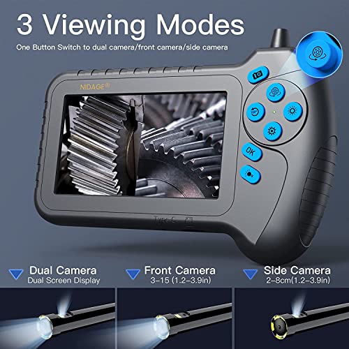 ⭐【 Usful 3 VIEWING MODES 】— Our digital scope camera provides 3 view-modes, can easily switch at a touch of a button according to your needs: side view, front view and dual view. With this dual lens borescope you can check narrow places without dead corner, also no details missed, making your repairing work so much easier no matter where you are.