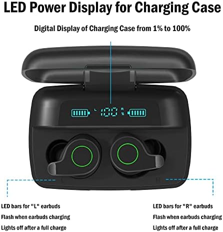 【Smart LCD Digital Display】Sports bluetooth headphones come with charging case, the led power display will directly show left power in percentage, so that you can easily check the power at any time(battery from 1% to 100%). Separated left and right headphone power consumption indicator, 5 grids in total, each grid represents 20% power of earphone. LED indicator light will flash while charging and lights off when fully charged.