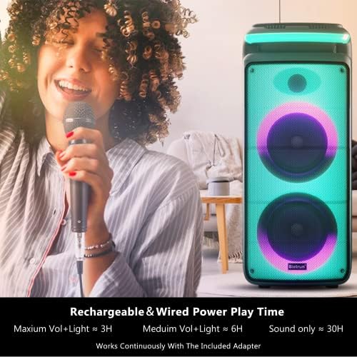 Long Play Time:●The speaker has a built-in 6000mAH rechargeable lithium battery, which works 3 hours at maximum volume and lights; 6 hours at medium volume and lights; 30 hours at medium volume and no lights (when charged 6H fully).●You can also plug the adapter(Included) into the speaker to use all the time.●It is perfect for parties, barbecues, camping, picnics or wherever you want to play music anytime.