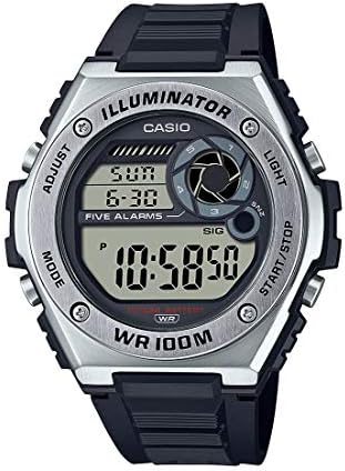 LED light; world time function; stop function – 1/100 sec. – 24 hours. Timer – 1/1 sec. ? 24 hours. Daily alarm, automatic calendar with date, month and weekday, 12/24 hour format, mineral glass, resin housing, resin strap, pin buckle, 10 years – 1 battery, water resistance rating (10 bar).