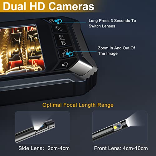 【Dual Lens Endoscope Camera with light】An extra HD camera is built on the side of the main camera to help detect the sides of the pipe. Long prees【set up】3 seconds to turn on sided camera to creates a 70-degrees-viewing-angle, totaling 140-degrees view to help detect the sides of the pipe and capture more details.