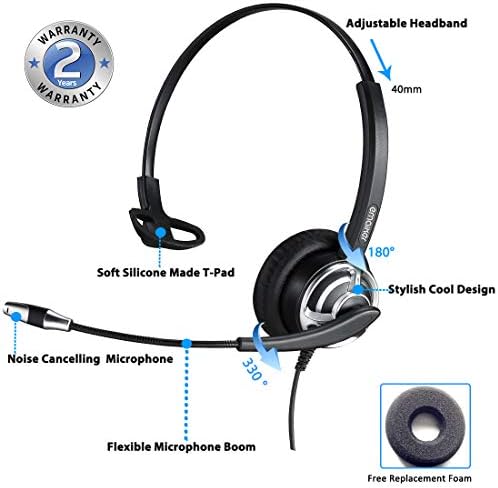 SUPER COMFORTABLE: Skype phone 3.5mm USB headset with plush soft protein leatherette ear cushion, user-friendly hygiene. Adjustable headband to fit for different head sizes, ear cover rotatable, no pain no push to ears for all day long wearing. Noise Cancelling microphone arm 330 degree rotatable for wearing mic on either side, professional PC communication headset for softphone in call centers and offices for chat,conference and e-learning, telemarketing.We promise 2-year warranty.