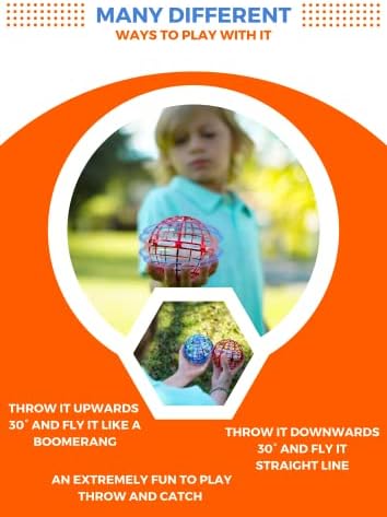Upgraded Flying Toy It’s packed with new features, including an upgraded motor for longer, faster flying. The enhanced spherical design means can move at higher speed, while a sturdier build promises improved safety and durability. And with 30-minutes of flying time, we’ve tripled the battery life of the original. Our fly toy pro comes with a USB charging cable. Simply connect it to a USB connector for 25 minutes to fully charge, and a single charge will give you a full 10 minutes of tricked out flight time. Flying Toys The hand controlled flying ball is made of high-quality materials, which is soft and crashworthy.Safety tested for use with children, it’s the best way to keep you and your loved ones entertained for hours. All while learning new skills, improving your hand-eye-coordination, and getting up off the couch and onto your feet. It’s the perfect cure for lockdown boredom and too much screentime. HOW TO USE 1.Shake to start Turn on the power button and hold the upwards, then simply shake to start and give it a toss! You will quickly understand the infinite possibilities for flight of the toy. 2.Fly back like a boomerang When you throw it upwards 30 ° to get flying. It will spins around its axis perpendicular to the direction of flight and returns to you like a boomerang. You can throw it and catch it yourself. 3.Travels straight line Throw it downwards 30° to get flying. It will fly travels steady in a straight line. It is perfect for a back & forth game of catch with friends. 4.Shake to stop If you wish to stop playing, just shake and stop the spinning. It’s easy and safe. The enclosed wheel design protects your hands while spinning.