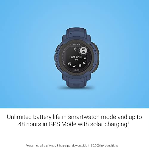 Whatever you do, own it with Instinct® 2 Solar. This rugged GPS smartwatch is tough enough to keep up with you and unique enough to fit your style. Plus, solar charging gives you unlimited battery life in smartwatch mode (assuming all-day wear with 3 hours per day outside in 50,000 lux conditions) so you can take on life’s unlimited possibilities. Do more of what you love with preloaded activity profiles for running, biking, swimming, strength training and more. When paired with a compatible smartphone, you even can stay connected to what matters to you with smart notifications, Garmin Pay™ and Connect IQ™ compatibility. Understand your body better with all-day health monitoring for energy levels, stress, sleep, Pulse Ox and much more (Pulse Ox not available in all countries. This device is intended to give an estimation of your activity and metrics; it is not a medical device).