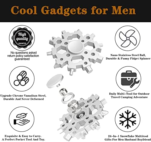 [ UNIQUE UPGRADE ] Different from traditional snowflake tools, we not only use upgrade chrome vanadium steel durable materials, but also have fidget spinners and multitool functions. This cool gadgets can be used to tighten the screws/bolts, open the bottle, repair the snowboard, bike, toys, and much more. Multifunction, portable, durable and funny. Awesome multitool gifts for men.
