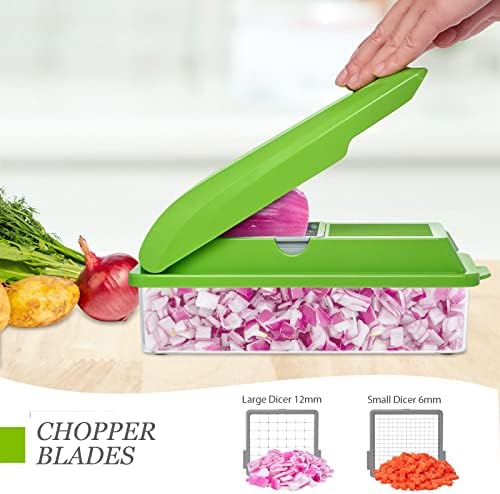 [5 INTERCHANGEABLE BLADES]-The vegetable cutter has 5 interchangeable blades for julienne, grating and slicing with ease. Built-in chop lid lets you cut foods directly into the collection tray without the mess of a knife and cutting board. Storage container lets you hold prepared vegetables in the Vegetable Cutter until you are ready to begin cooking.