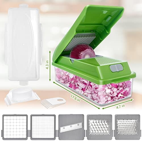 [MULTI-FUNCTIONAL CHOPPER]Heavy duty stainless steel retains razor sharpness for crisp, smooth cutting and grating. 5 interchangeable Blades snap in and out with ease. Cut potatoes, tomatoes, cucumbers, carrots and more. Multi-functional vegetable cutter to meet almost all your vegetable cutting needs.