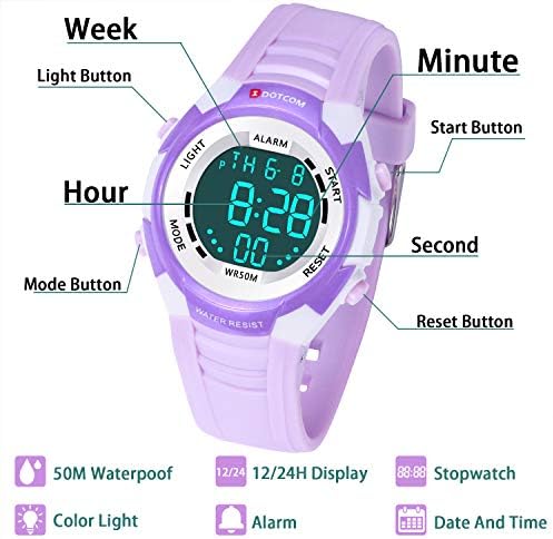 Multifunctional Kids Watch: Sports Watch with Alarm, Stopwatch, 50M Water Resistance, Calendar, EL Backlight, 12H/24H, Shock Resistant. This children’s watch is multifunctional to meet children’s daily use and is very suitable for various sports.