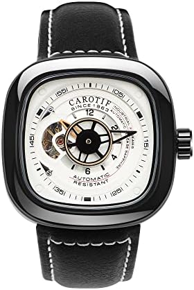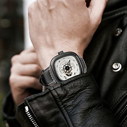 Mens Automatic Watches Waterproof Watches for Men Square Rectangle Mens Watches Men’s Analog Quartz Big Skeleton Dial Wristwatch Black/Brown Leather Band Stainless Steel Case Unique Gift for Men