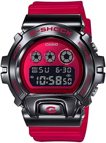 From Casio G-Shock, the innovators of tough timekeeping, comes the urban and edgy GM6900 series digital watch. Inspired by music icons, this on-trend timepiece boasts a durable design that is punctuated with a 49.7mm case that is covered with a black ion-plated stainless steel metal bezel. The coordinating red dial and transparent red resin band add a bold color palette to this resilient style. Commemorating the 25th anniversary of the iconic DW6900 G-Shock series and featuring all of the technical specifications you have come to expect from G-Shock, this watch is both eye-catching and functional. Features: Shock resistant, Electro-luminescent backlight Afterglow, 49.7mm case with metal bezel, Red dial, Flash alert Flashes with buzzer that sounds for alarms, hourly time signal, 1/100-second stopwatch, Countdown timer, Multi-functional alarm, Hourly time signal, Full auto-calendar (to year 2099), 12/24-hour format, Regular timekeeping: Hour, minute, second, pm, month, date, day, Red transparent resin band with silver buckle closure, 200 meter water resistant, Casio G-Shock Style #: GM6900B-4