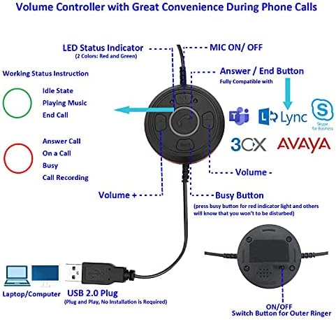 Inline Control Buttons: This teleconference headset has enhanced inline control buttons to make your phone calls much easier, such as volume up/down, mic mute, working status etc. You can switch the button to outer ringer so you will not miss conference calls. If you press the BUSY button and the red indicator will tell your colleagues that you won’t to be disturbed. What’s more, this USB headphone has answer/end call button which works with Microsoft Teams, Skype for Business