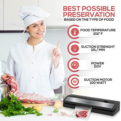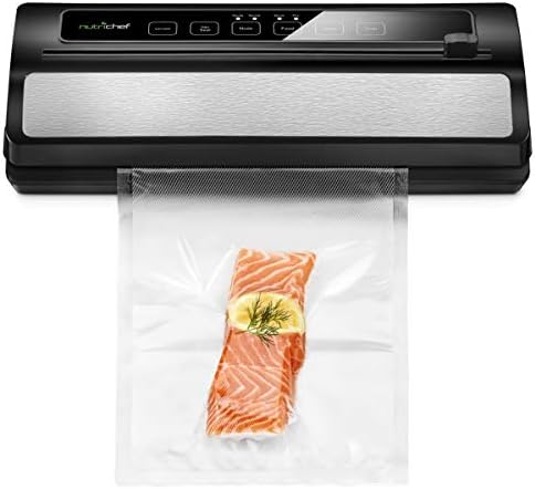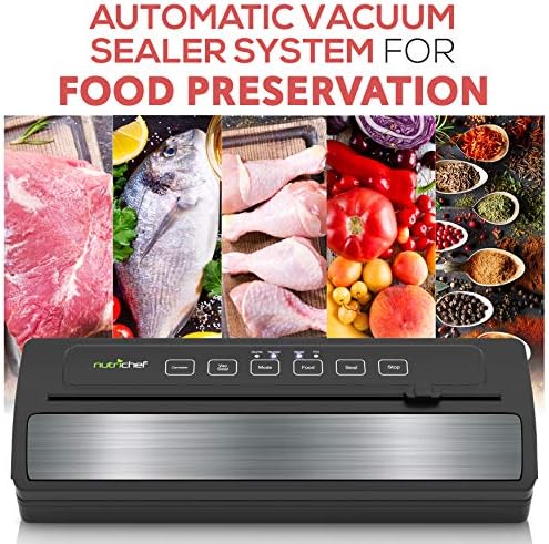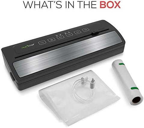 NutriChef Model : PKVS25BKDigital Food Vacuum Sealer SystemAutomatic Food Vacuum Sealer – Electric Air Sealing Preserver System with Reusable Vacuum Food Bags Features:Automatic Vacuum Air Sealing Made EasySave Time & Money with Smart Meal PrepLab Tested to Effectively Increase Food Shelf LifeSimple Electric Plug-in Design with Hassle-Free OperationAbility to Seal Dry & Moist Food TypesIntegrated Roll Cutter for Custom Cut Bag SizesSelectable Air Seal Modes: ‘Gentle’ +‘Normal’ Vacuum SealingUsed for Dieting by Pre-Determining Food PortionsCreates Strong, Air-Tight Bags via Heat-SealingRe-Usable & Waterproof Air-Sealing BagsHigh-Power Suction ElementLED Indicator LightsTop Panel Digital Button ControlsStain-Resistant & Easy-to-Clean HousingSafe Placement on Any Kitchen Table/CountertopCan Also be Used for Preserving/Waterproofing Non-Food Items What’s in the Box:Vacuum Sealer (5) Medium Vacuum Bags (7.8’’ x 11.8’’ -inches)Long Vacuum Bag Roll (7.8’’ x78.7’’ -inches)Vacuum Air HoseTechnical Specs:High-Power Suction Element: 110 WattVacuum/Suction Strength: 12L/min (-0.6 bar)Vacuum Air Hose Length: 1.3’ ft.Sealable Bags:Friendly PolyamideWithstands Food Temperature of 212°Fahrenheit Max.*Vacuum Air Hose Connects to NutriChef Vacuum Seal Container Models: PKVSCN1L, PKVSCN2L (Sold Separately)Construction Material: Engineered ABS, Stainless SteelPower Cord Length: 3.3’ ft.Power: 110VDimensions (L x W x H): 14.4’’ x 5.5’’ x 3.0’’ -inches