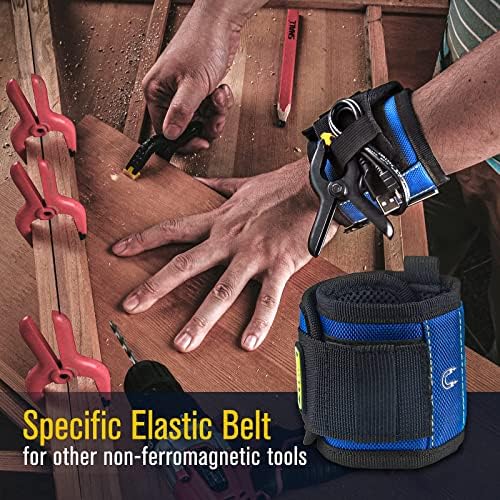 New Elastic Loop/Belt Design – SHALL magnetic wristband features a side elastic loop for a woodworking pen and a widened elastic belt for non-metallic tools such as clamps or coils, etc.
