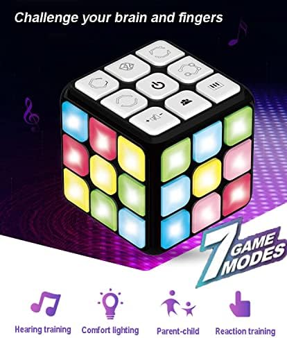 Keep Your Brain Running FastGeared for kids and adults ages over 6 , Flashing cube offers fun and adventure packed into a compact light-up vocalization cube that’s easy to take along with you for entertainment on the go.With a variety of built in 7 single-player games that develop quick thinking and even quicker fingers, this vocalization light up cube will keep you coming back for more!Universal Gift IdeaTreat your child, neighbor, sibling, friend, co-worker etc. to a unique ; entertaining gift that’s sure to be appreciated and enjoyed.Light Show ModeSimply press a button and be rewarded with a dazzling demonstration of flashing multicolored lights!Adjustable VolumeFun sound effects accompany each game, but they’re easy to turn down or off when you need some peace and quiet.Recently, the product replaced with new environmentally friendly packaging, the warehouse manager will randomly select the old and new packaging when shipping.However, please rest assured that the products inside are exactly the same, regardless of the packaging.