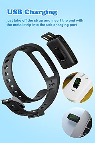 Smart watch tracker compatible with iPhone and Android Phone, compatible with most iOS 9.0 & Android 5.0 above smart phones, smart band Information notification bracelet will vibrate to remind you, Include SMS, Twitter, Facebook, Skype, Instagram etc. not support answering calls and sending messages. easy charging, from “OPEN” sides pull out the strap which is below the touch key, you will see the built-in USB plug with metal pins. Insert the metal pins into any USB port/Wall charger