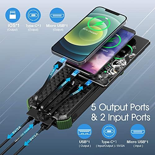 5 Output Ports & 2 Input Ports : The portable solar phone charger power bank quick charge has micro usb input and type-c input, usb output type-c output and IOS & Type-C & Micro USB output ports to reject messy cables. You don’t need to carry cables to go to outside, you will get rid of cumbersome cables with it.
