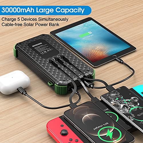 This solar power bank no need to carry phone charging cable,it’s built-in micro,type-c,lightning cable,suit for your all device.The outdoor external battery support 5 output, let you enjoy your charging time with your family or fiends.30000mAh big capacity powerful enough to juice up your phone for several times.Fast charging power bank, 2A outputs let you 2X faster power up your devices,save your time.Built-in dual-flashlight(with SOS mode & strobe modes),a perfect and must-have outdoor companion.Solar charging power bank with dual input ports, Micro USB and Type-C input ports, and equipped with a Micro USB charging cable, it makes charging more convenient.Brand manufacturing, safety protection, make the phone charger longer life.