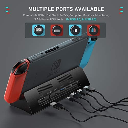 Multiple Ports Available: This Switch TV dock features 1 HDMI port, 3 USB ports, 1 switch button, 2 USB C charging ports. Connect it with HDMI-supported output devices such as TVs, computer monitors & laptops. Charging while playing. 1 button to switch between TV mode or console mode. 3 additional USB ports (1x USB 3.0; 2x USB 2.0) allows you to connect additional devices