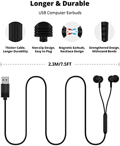 【7.5ft Longer Wired & Non-Slip Plug】The cord is much thicker and longer than other earphones on the market to withstand bends, and provides higher efficiency, more convenience and better experience in everyday use. Non-slip design for easy plug/unplug without damaging the earbuds or your computer, ensure longer durability. Come with 1 x USB Earbuds, 1 x Wired Clip, 1 x Carrying case, 2 x extra siliconet tips (S/L). Any problem, feel free to contact TITACUTE Service for solutions at any time.