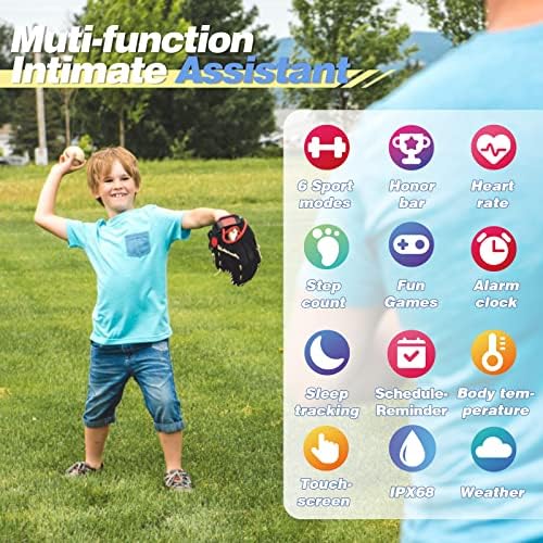 【Multifunctional Kids Fitness Watch】The kids smart watches with the function of Body Temperature monitor, Pedometer, Stopwatch, Heart rate monitor, Sleep monitor, Emoji Interaction, games, alarm clock, Drink water reminder, Honor bar, Weather monitor, etc. 6 Sport modes, such as Walking, Running, Cycling, basketball, football, etc. Which can bring convenience and fun to children in their healthy lives.