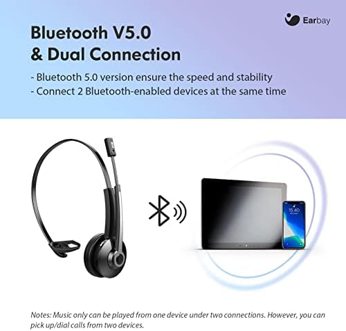 【Bluetooth V5.0 & Dual Connection】: The latest Bluetooth 5.0 technology makes this wireless headset with mic transmit stable signal more quickly and lower power waste. It can pair with 2 Bluetooth-enabled devices at the same time, Switch between chat, Skype, Zoom meetings and music freely.