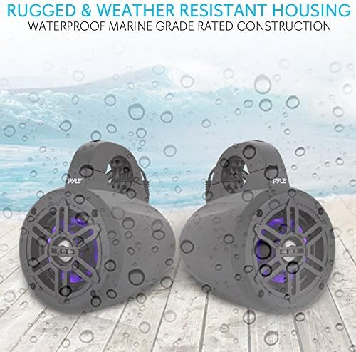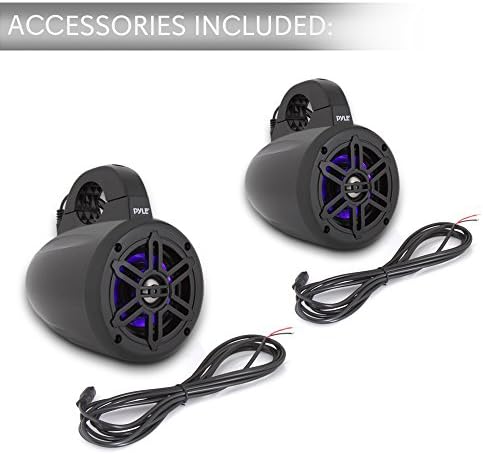 Features: – includes (2) wakeboard Tower speakers – waterproof marine grade Rated construction – rugged & weather-resistant housing – Bluetooth wireless music steaming – Compact mountable design – Built-in LED illuminating lights – 2-way full range audio speaker system – Titanium dome tweeters – long excursion subwoofers – anti-corrosion, UV resistant coating – integrated Universal roll bar mounting clamps Bluetooth connectivity: – Built-in Bluetooth wireless streaming receiver – works with all of today’s latest devices – (smartphones, tablets, laptops, computers, etc.) – Bluetooth version: 4.0 – Bluetooth network name: ‘Pyle’ – Bluetooth network password: ‘0000’ (4 zeroes) – wireless range: 30’+ ft. What’s in the box: – (2) Bluetooth LED marine speakers – integrated mounting clamps – power supply cable technical Specifications: – power Output: 300 Watt Max (150 Watt RMS) – sound system: 4″ subwoofers, 1.0″ tweeters – waterproof marine grade rating: ip-44 – boat roll Cage/ roll bar support size: up to 1.96″ (5cm) – tweeter type: Titanium dome – Frequency response: 70Hz-20KHz – impedance: 4 ohms – magnet: 10 oz. – sensitivity: 90 db. – construction material: engineered ABS grills – power supply: DC 12V – speaker housing size (L x w x H): 5.4″ x 7.6″ x 7.0′-Inches (with mounting Bracket)