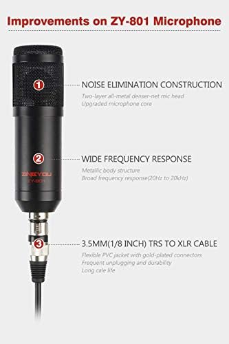 IMPROVEMENTS MAKE IT BETTER – The engineers made 3 important improvements on the ZY-801+: capsule, microphone head, XLR cable. Upgraded microphone core, improved sensitivity can pick up near the source and reduce ambient noise; Microphone head adopts denser net, reducing surrounded unnecessary noise and making recording clearer from a sound source; 1/8″ TRS Stereo to XLR Female cable is robust construction including a flexible PVC jacket with gold-plated connectors in a rugged metal housing