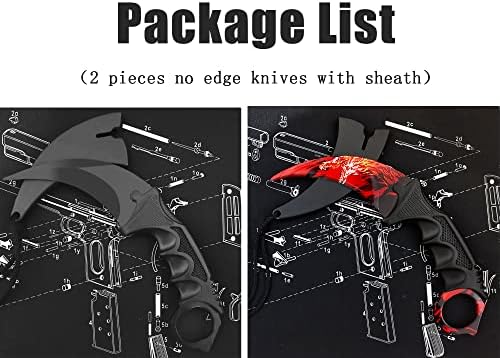 The package contains 2 pieces fixed blade no edge training knife with sheath. Perfect for beginners. No sharp blade, safe training